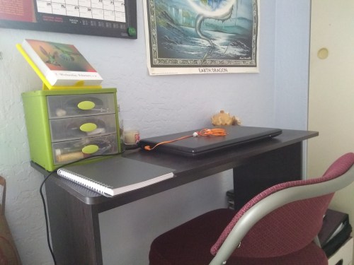 I’m also very happy, because part of the getting settled process involved getting a writing corner set up in my room. Combined with the coffee shop half a mile from the house means, this means that I have almost unlimited opportunities for bunkering down and coaxing/threatening/luring words onto the page. If that’s not a recipe for a good writing environment, I’m sure I don’t know what is.